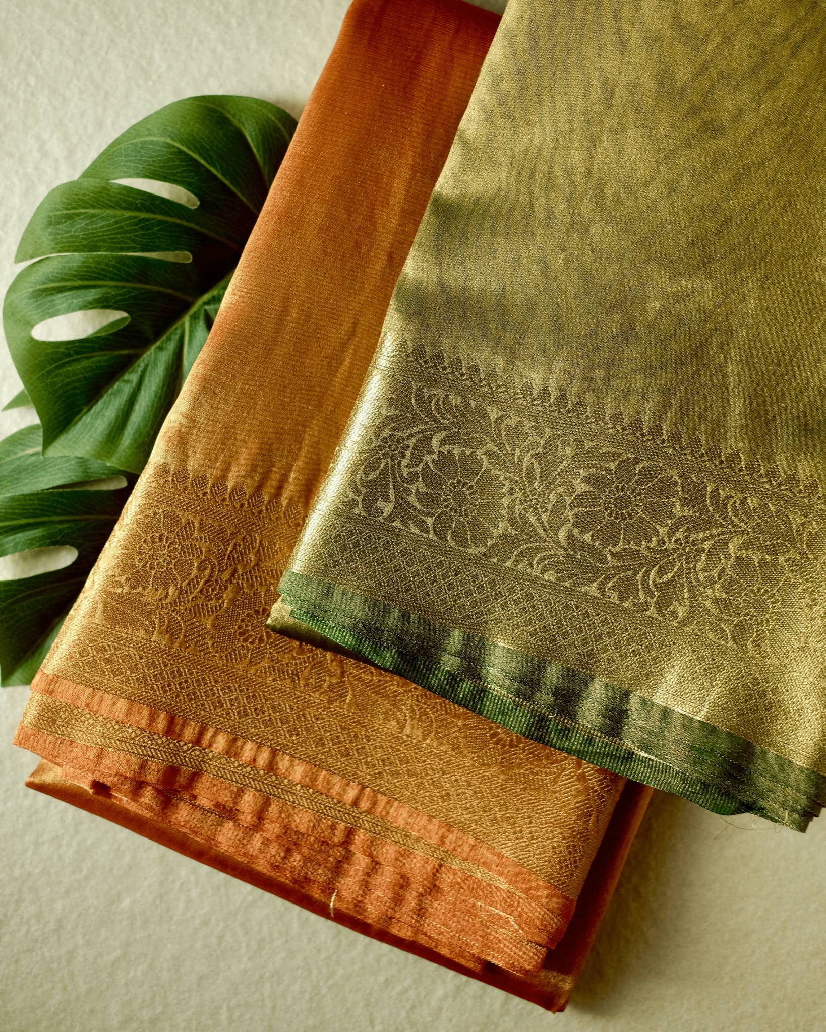 Premium tissue silk saree with golden floral zari work.It comes with blouse and is available in Orange and Olive green shade.